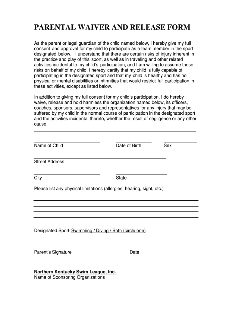 PARENTAL WAIVER AND RELEASE FORM As the parent or legal guardian of the child named below, I hereby give my full consent and approval for my child to participate as a team member in the sport designated