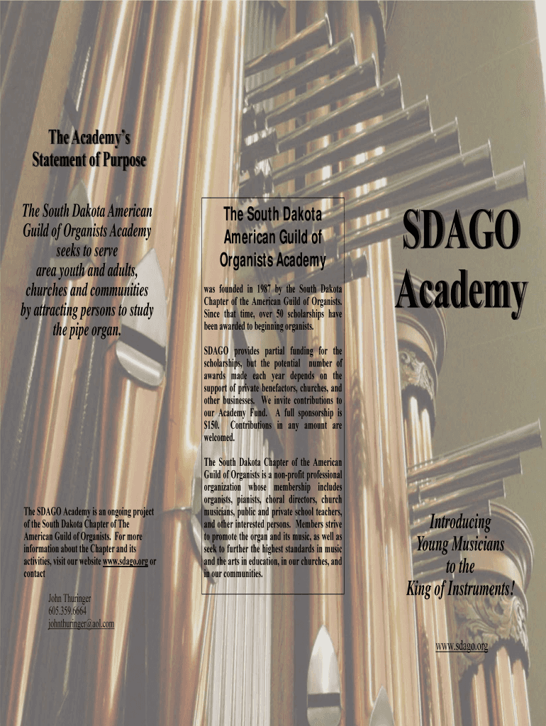 The Academies Statement of Purpose The South Dakota American Guild of Organists Academy seeks to serve area youth and adults, churches and communities by attracting persons to study the pipe organ.
