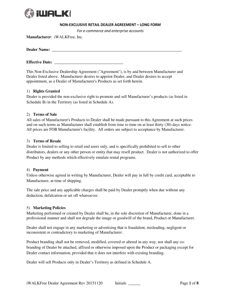 IWALKFree Dealer Agreement Rev 20151120 Initials Page 1 of 8 NON-EXCLUSIVE RETAIL DEALER AGREEMENT LONG FORM For e-commerce and enterprise accounts