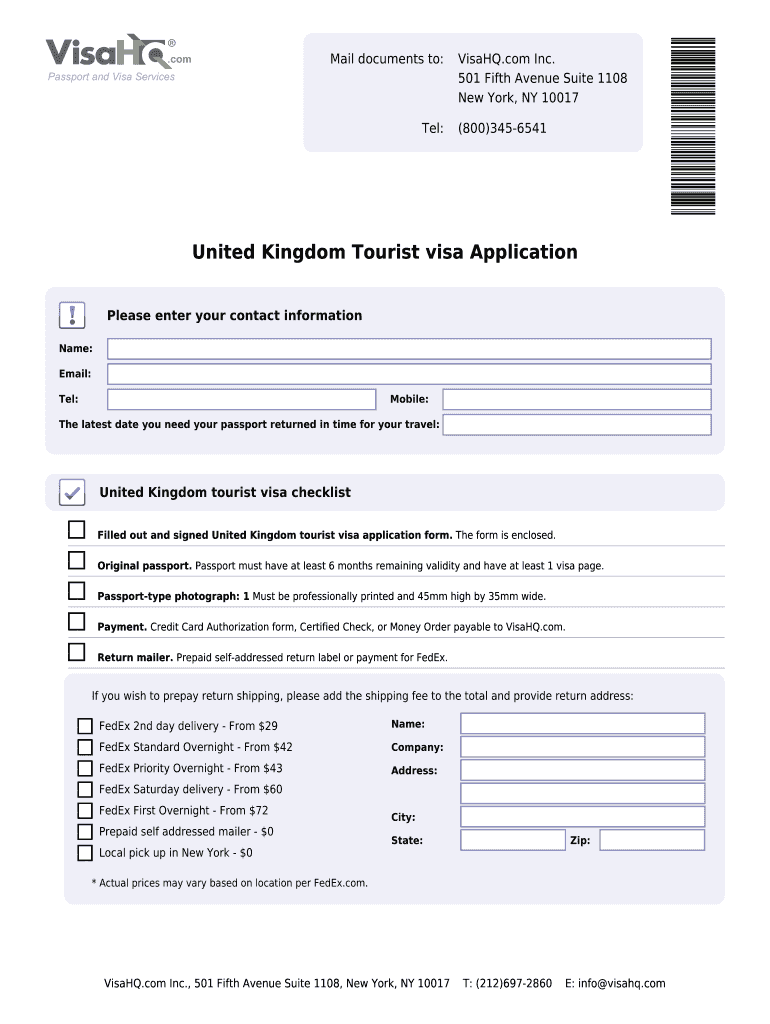 Filled out and signed United Kingdom tourist visa application form. The form is enclosed. Original passport. Passport must have at least 6 months remaining ...