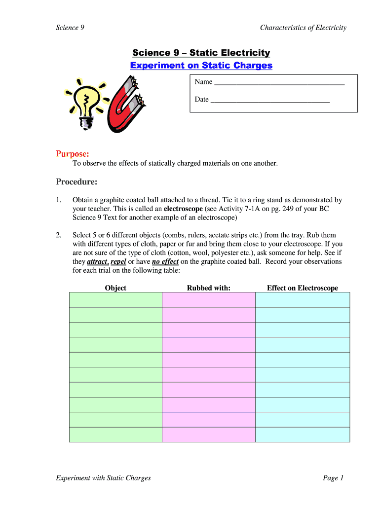 Science 9 Characteristics of Electricity Science 9 Static Electricity Experiment on Static Charges Name Date Purpose: To observe the effects of statically charged materials on one another. Procedure: