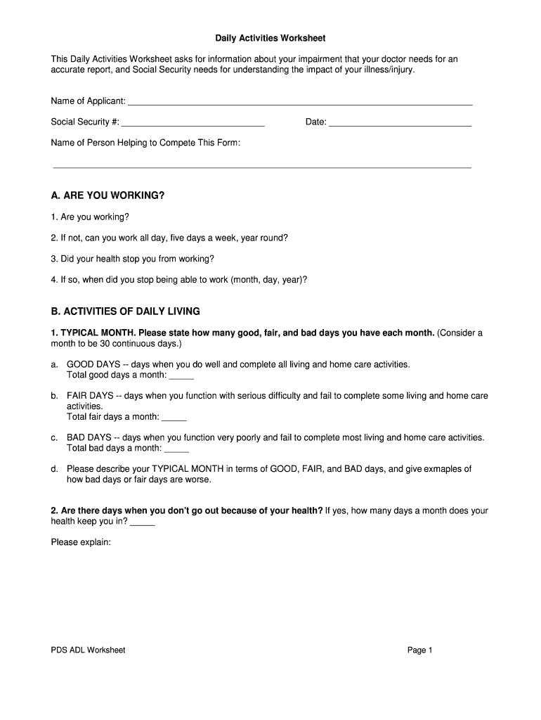 If you have questions while completing the Daily Activities Worksheet, consider contacting a healthcare professional or a legal representative for assistance, or refer to the instructions provided within the form.