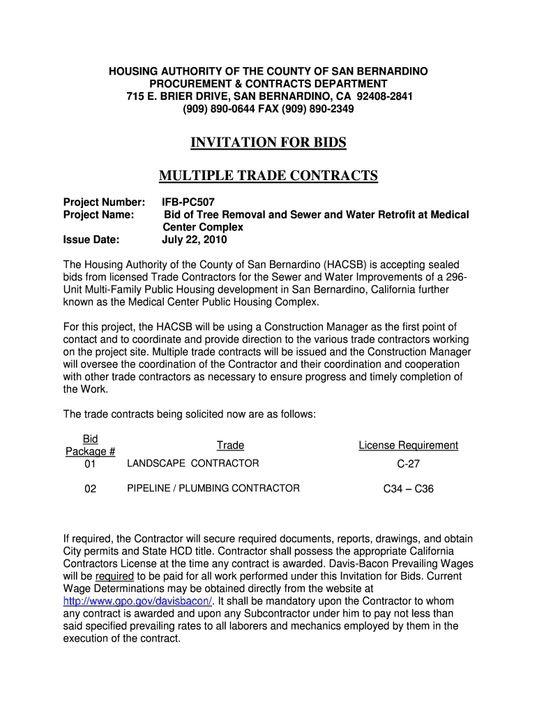 HOUSING AUTHORITY OF THE COUNTY OF SAN BERNARDINO PROCUREMENT & CONTRACTS DEPARTMENT 715 E. BRIER DRIVE, SAN BERNARDINO, CA 924082841 (909) 8900644 FAX (909) 8902349 INVITATION FOR BIDS MULTIPLE TRADE