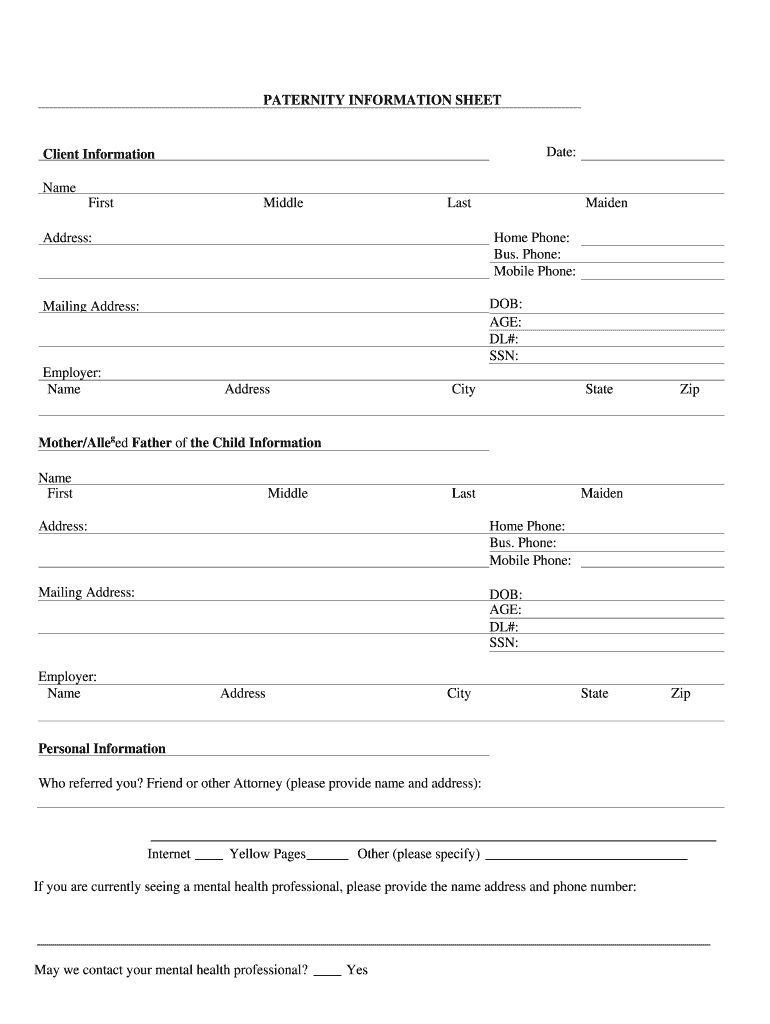 PATERNITY INFORMATION SHEET Date: Client Information Name First Middle Last Maiden Home Phone: Bus. Phone: Mobile Phone: Address: DOB: AGE: DL#: SSN: Mailing Address: Employer: Name Address City State