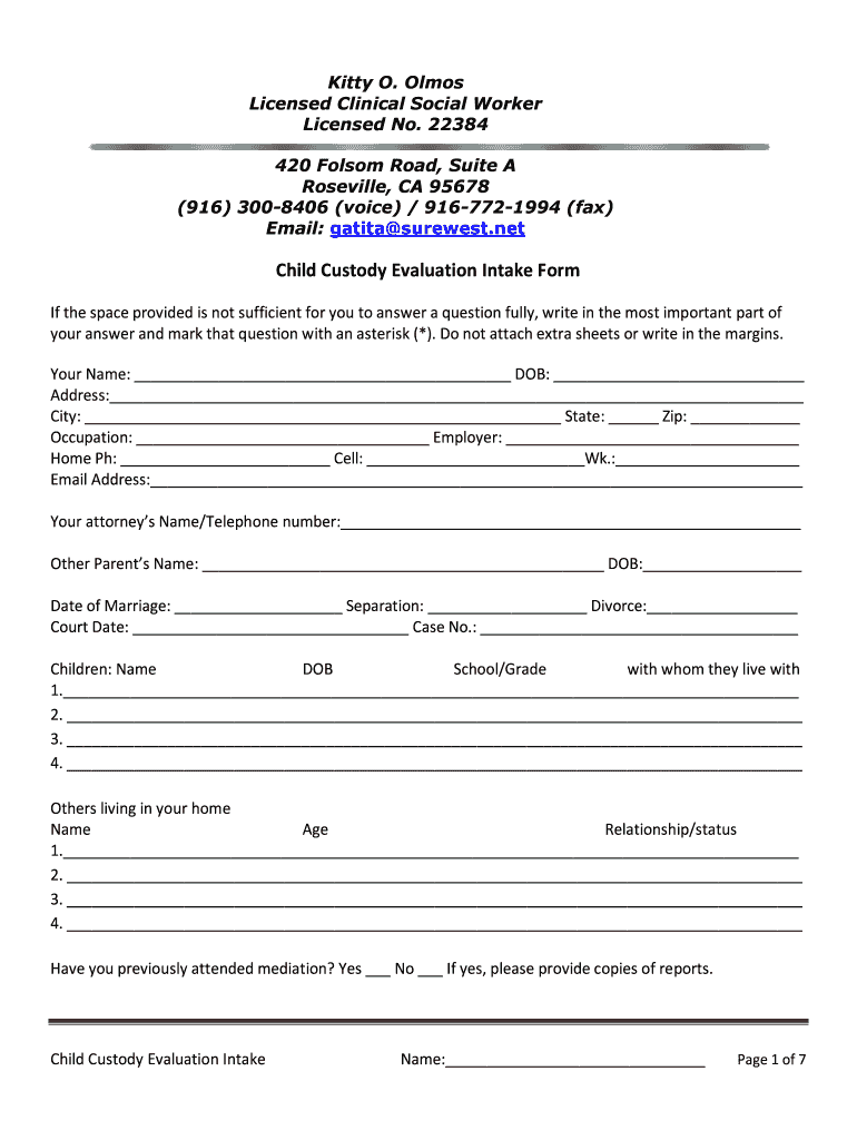 Get the free Child Custody Evaluation Intake Form - bkittyolmosbbcomb