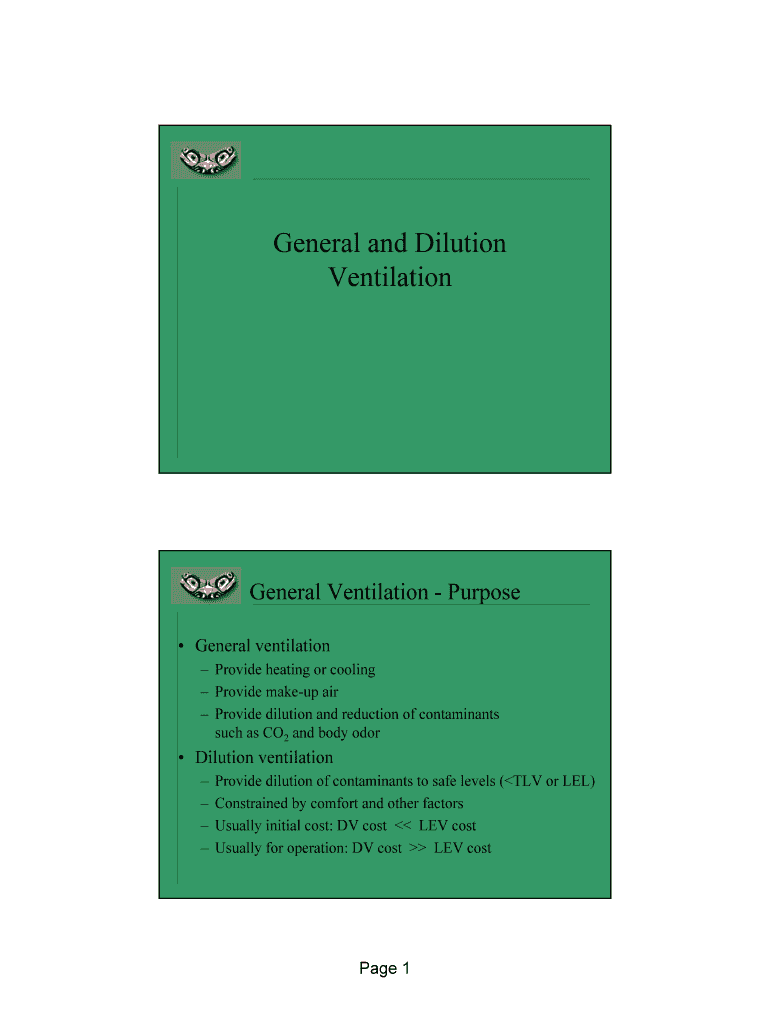 General and Dilution VentilationGeneral Ventilation Purpose General ventilation Provide heating or cooling Provide makeup air Provide dilution and reduction of contaminants such as CO2 and body odor