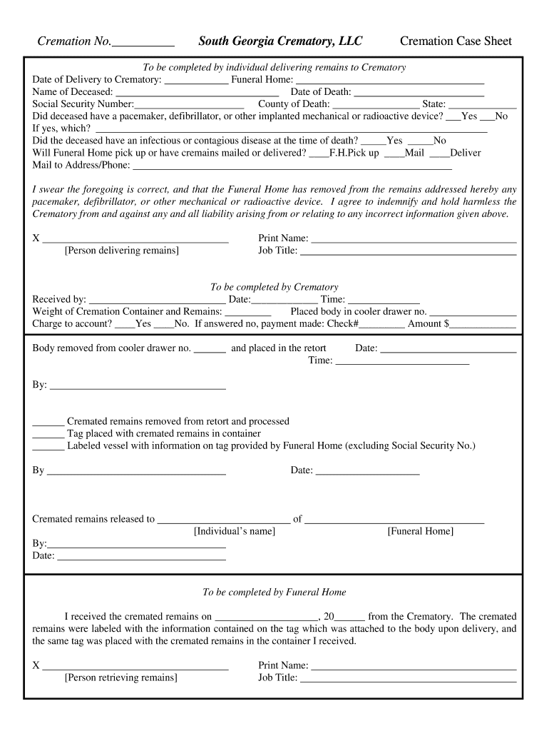Cremation No. South Georgia Crematory, LLC. Cremation Case Sheet. To be completed by individual delivering remains to Crematory. Date of Delivery to Crematory: