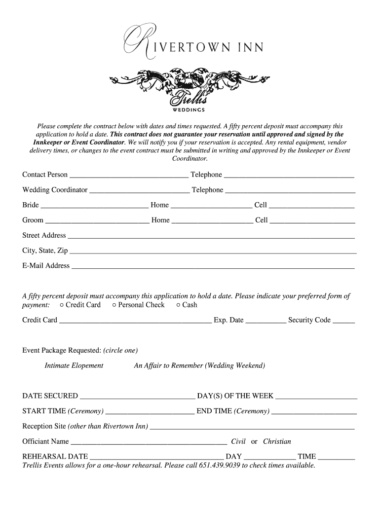 Please complete the contract below with dates and times requested. A fifty percent deposit must accompany this application to hold a date. This contract does not guarantee your reservation until approved