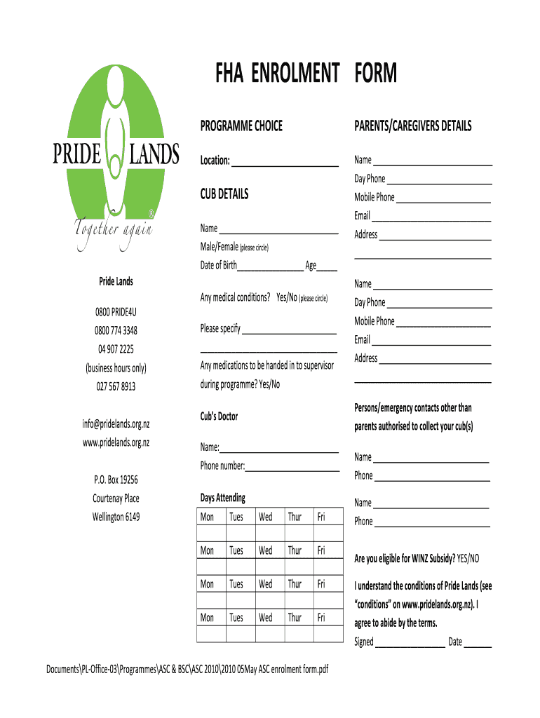 FHA Enrollment FORM Program CHOICE PARENTS/CAREGIVERS DETAILS Location: Name Day Phone Mobile Phone Email Address CUB DETAILS Pride Lands 0800 PRIDE4U 0800 774 3348 04 907 2225 (business hours only)