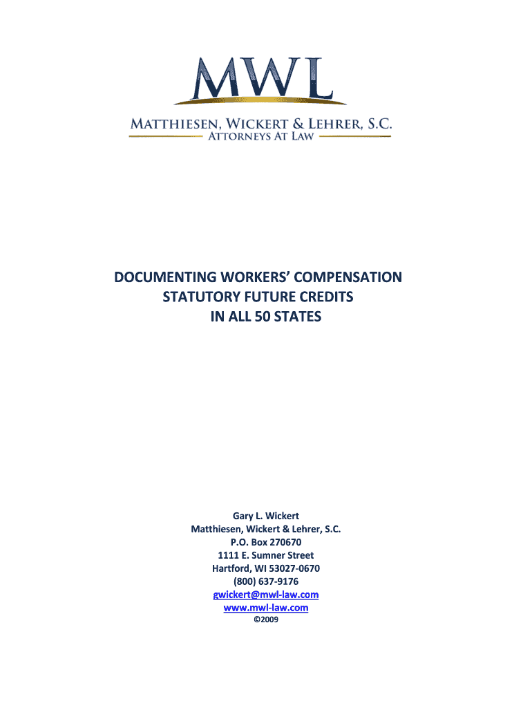 DOCUMENTING WORKERS COMPENSATION STATUTORY FUTURE CREDITS IN ALL 50 STATES Gary L. Wicket Matthias, Wicket & Leader, S.C. P.O. Box 270670 1111 E. Sumner Street Hartford, WI 530270670 (800) 6379176