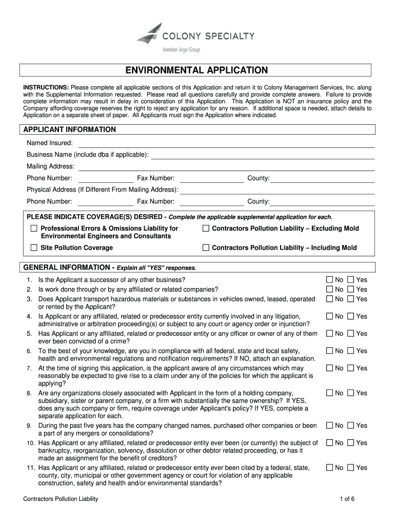 The Environmental Application for Contractors Pollution Liability is a business form used by companies to apply for contractors pollution liability insurance coverage.