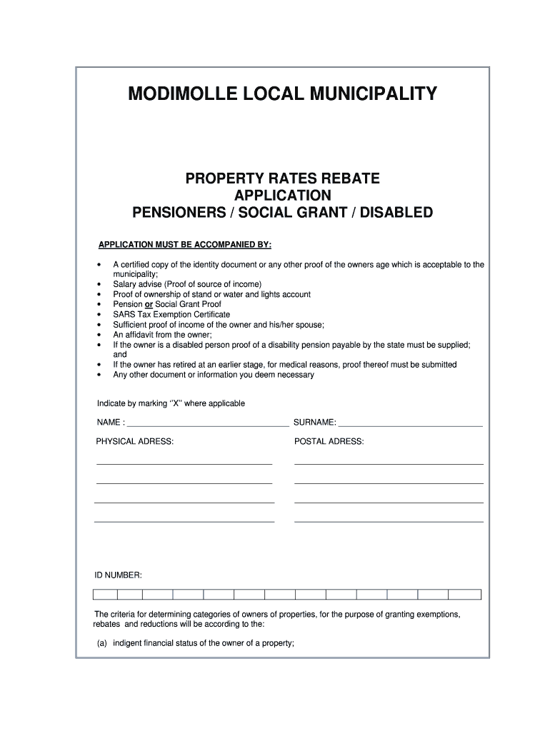 This rebate application is intended for various demographics, particularly for pensioners, disabled persons, and social grant recipients. Individuals falling within these categories can access significant financial benefits by applying for a property rates rebate.