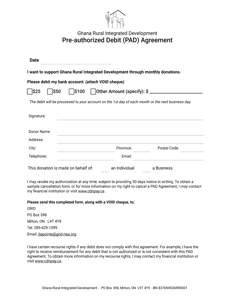 Ghana Rural Integrated Development PO Box 398, Milton, ON L9T 4Y9 IN 837694926RR0001 Ghana Rural Integrated Development Pre-authorized Debit (PAD) Agreement