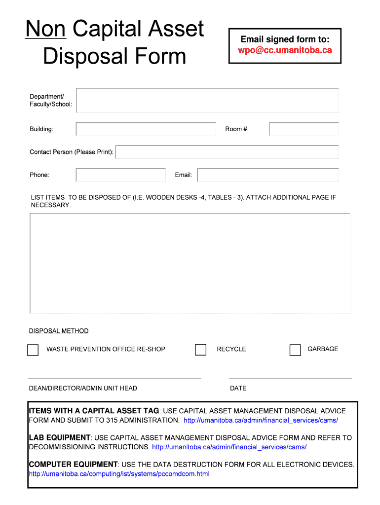 Non-Capital Asset. Disposal Form. Email: Department/. Faculty/School: Building: Contact Person (Please Print): Room #: Phone: ITEMS WITH A CAPITAL ...