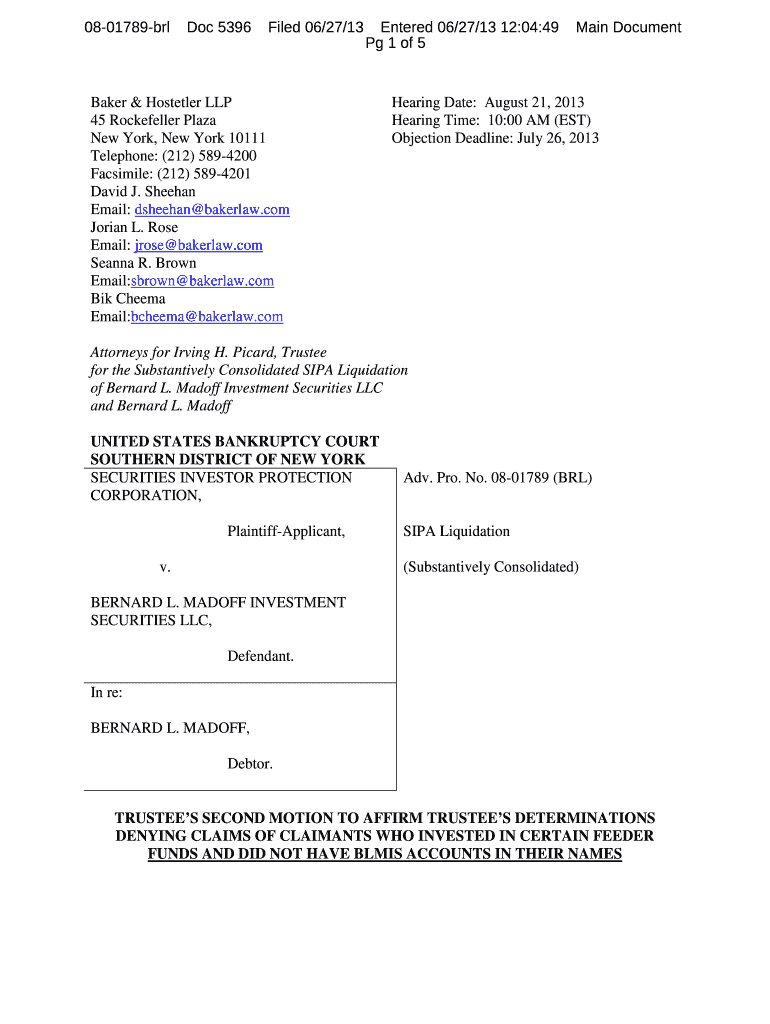 0801789brl Doc 5396 Filed 06/27/13 Entered 06/27/13 12:04:49 Pg 1 of 5 Baker & Hosteler LLP 45 Rockefeller Plaza New York, New York 10111 Telephone: (212) 5894200 Facsimile: (212) 5894201 David J.