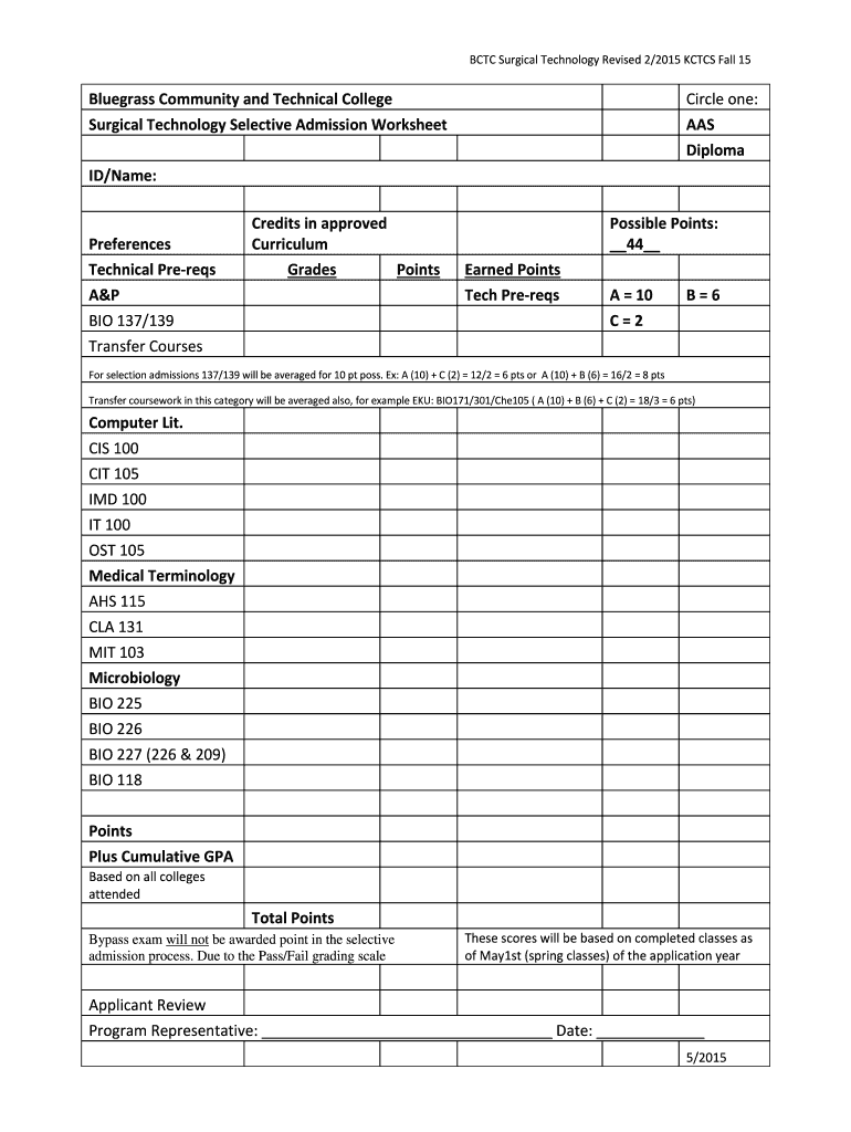 CTC Surgical Technology Revised 2/2015 ACTS Fall 15 Bluegrass Community and Technical College Surgical Technology Selective Admission Worksheet Circle one: AAS Diploma ID/Name: Preferences Technical