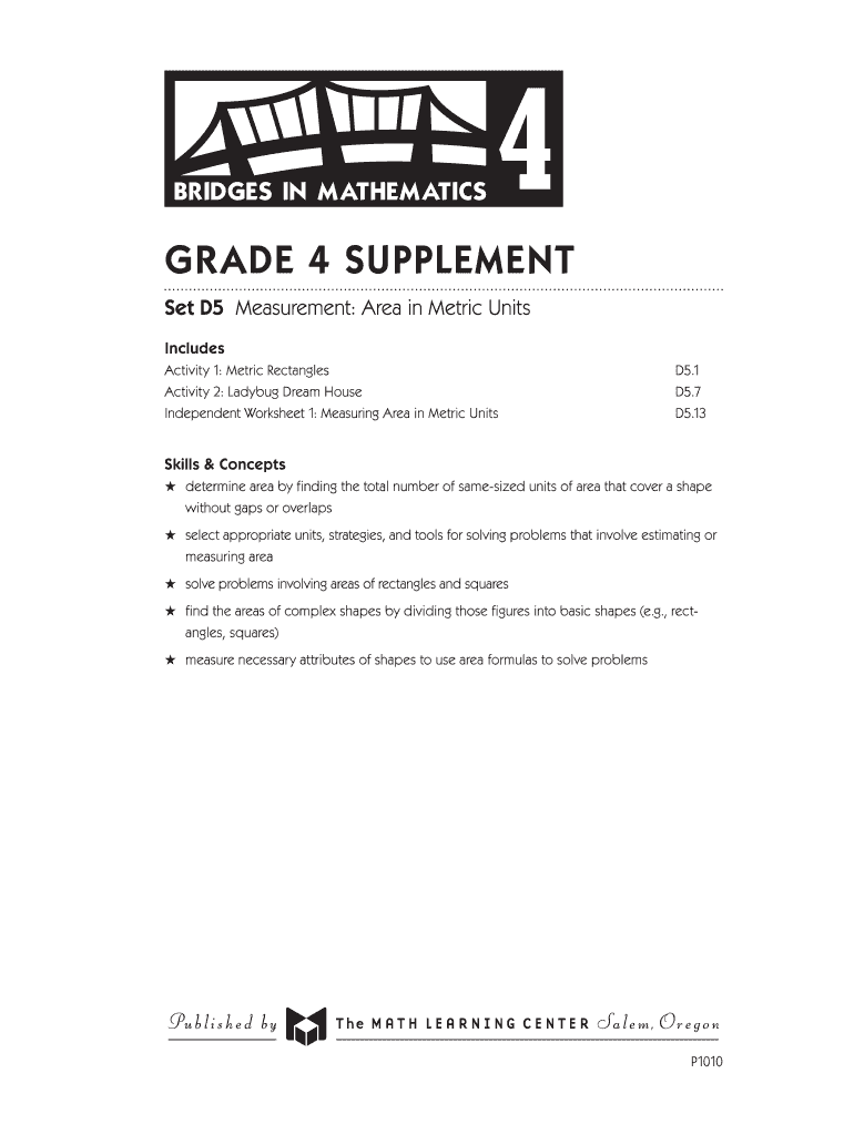 GRADE 4 SUPPLEMENT Set D5 Measurement: Area in Metric Units Includes Activity 1: Metric RectanglesActivity 2: Ladybug Dream HouseIndependent Worksheet 1: Measuring Area in Metric UnitsD5.1 D5.7 D5.13Skills