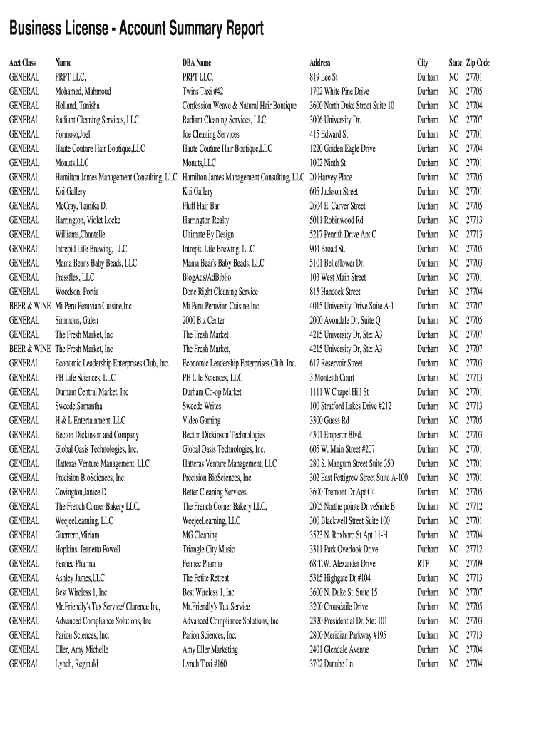 Get the free Business License Account Summary Report Acct Class GENERAL GENERAL GENERAL GENERAL G...