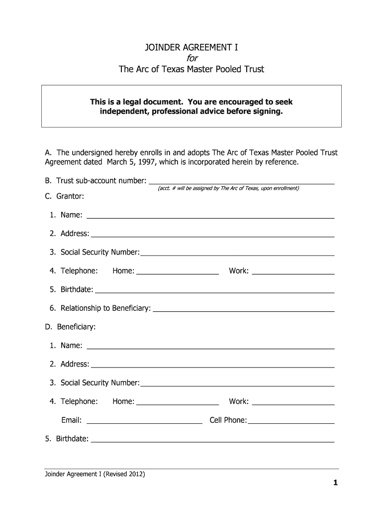 JOINER AGREEMENT I for The Arc of Texas Master Pooled Trust This is a legal document. You are encouraged to seek independent, professional advice before signing. A. The undersigned hereby enrolls