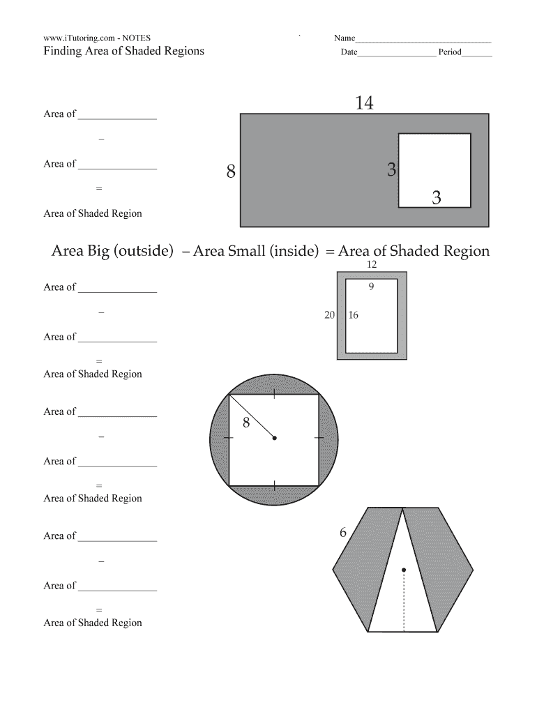 WWW.iTutoring.com NOTES Name Finding Area of Shaded Regions Date Period 14 Area of 3 8 3 Area of Shaded Region Area Big (outside) Area Small (inside) Area of Shaded Region 12 Area of 9 20 16 Area