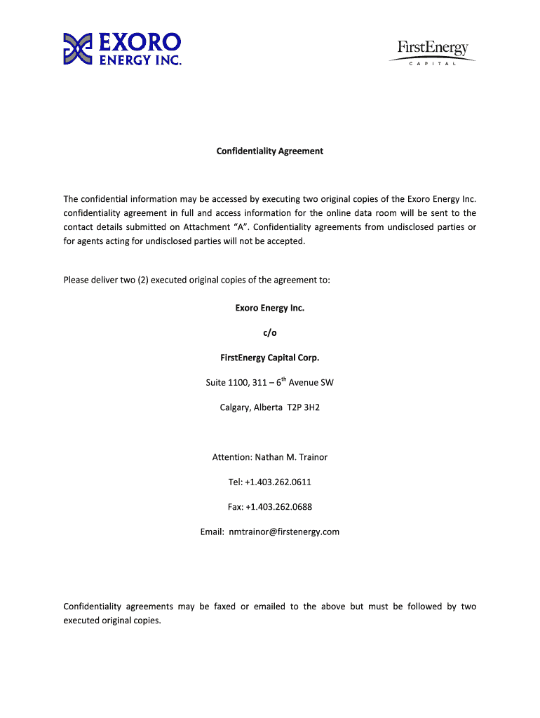 ConfidentialityAgreement TheconfidentialinformationmaybeaccessedbyexecutingtwooriginalcopiesoftheExoroEnergyInc. Confidentiality agreement in full and access information for the online data room will