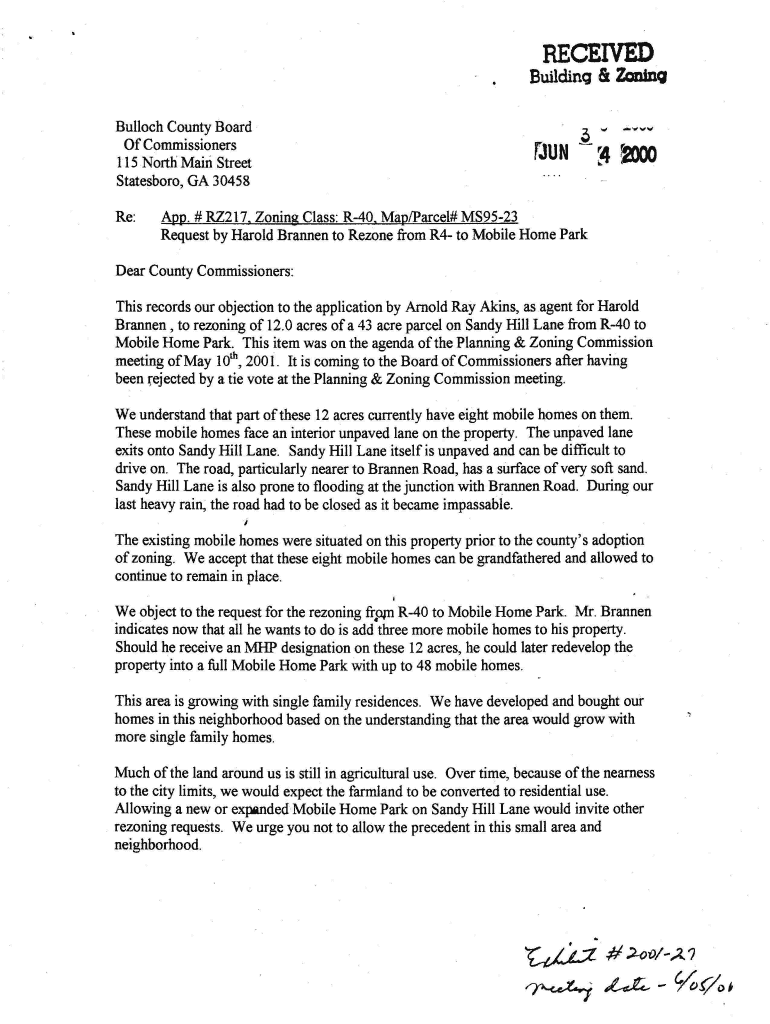 RECEIVED Building & Zoning Bullock County Board Of Commissioners 115 North Main Street Scottsboro, GA 30458 Re:rJUN3. ., 'WI...,,,,r2000App. # RZ217, Zoning Class: R40, Apparel# MS9523 Request by
