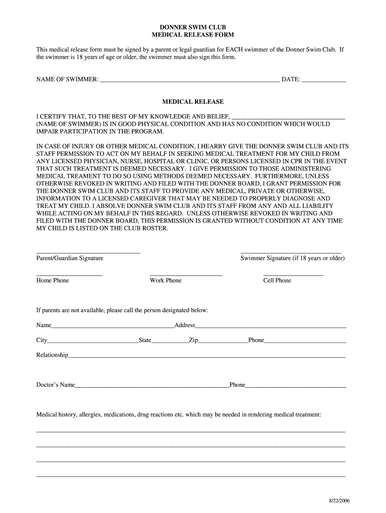 DONNER SWIM CLUB MEDICAL RELEASE From This medical release form must be signed by a parent or legal guardian for EACH swimmer of the Donner Swim Club. If the swimmer is 18 years of age or older, the