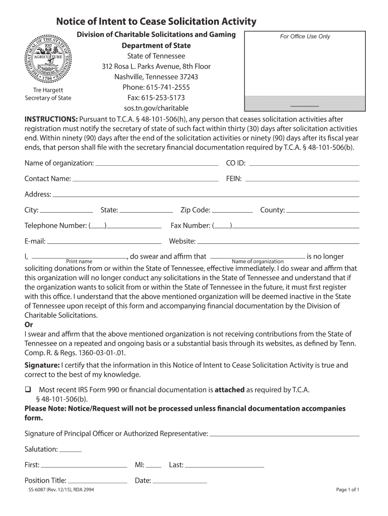 SS-6087 (Rev. 12/15), RDA 2994 ... Fax: 615-253-5173 ... of Tennessee upon receipt of this form and accompanying financial documentation by the Division of.