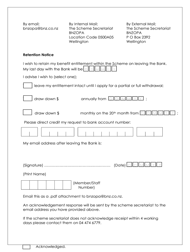 By email; Nova BNZ.co.NZ By Internal Mail; The Scheme Secretariat BNZ OPA Location Code 0500A05 Wellington By External Mail; The Scheme Secretariat BNZ OPA P O Box 2392 Wellington Retention Notice