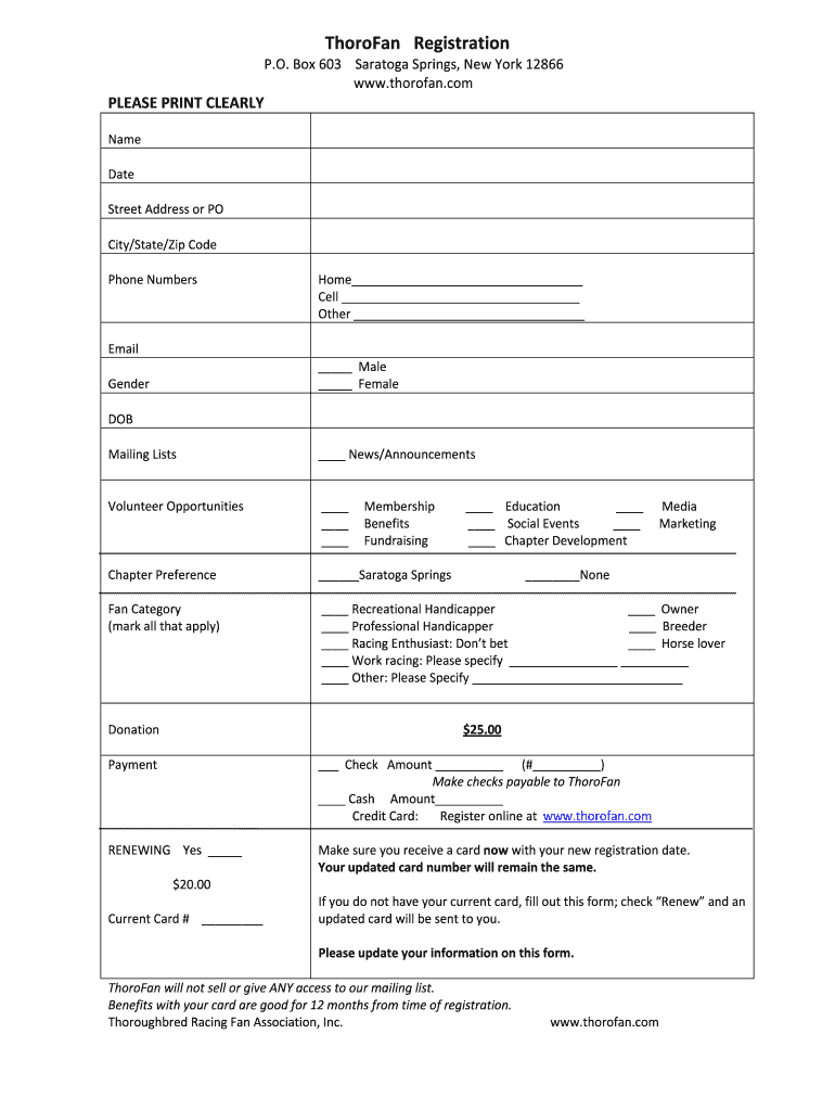 ThoroFanRegistration P.O. Box603SaratogaSprings,NewYork12866 www.thorofan.com PLEASEPRINTCLEARLY Name Date StreetAddressorPO City/State/Opcode Phone Numbers Email Gender DOB MailingLists VolunteerOpportunities