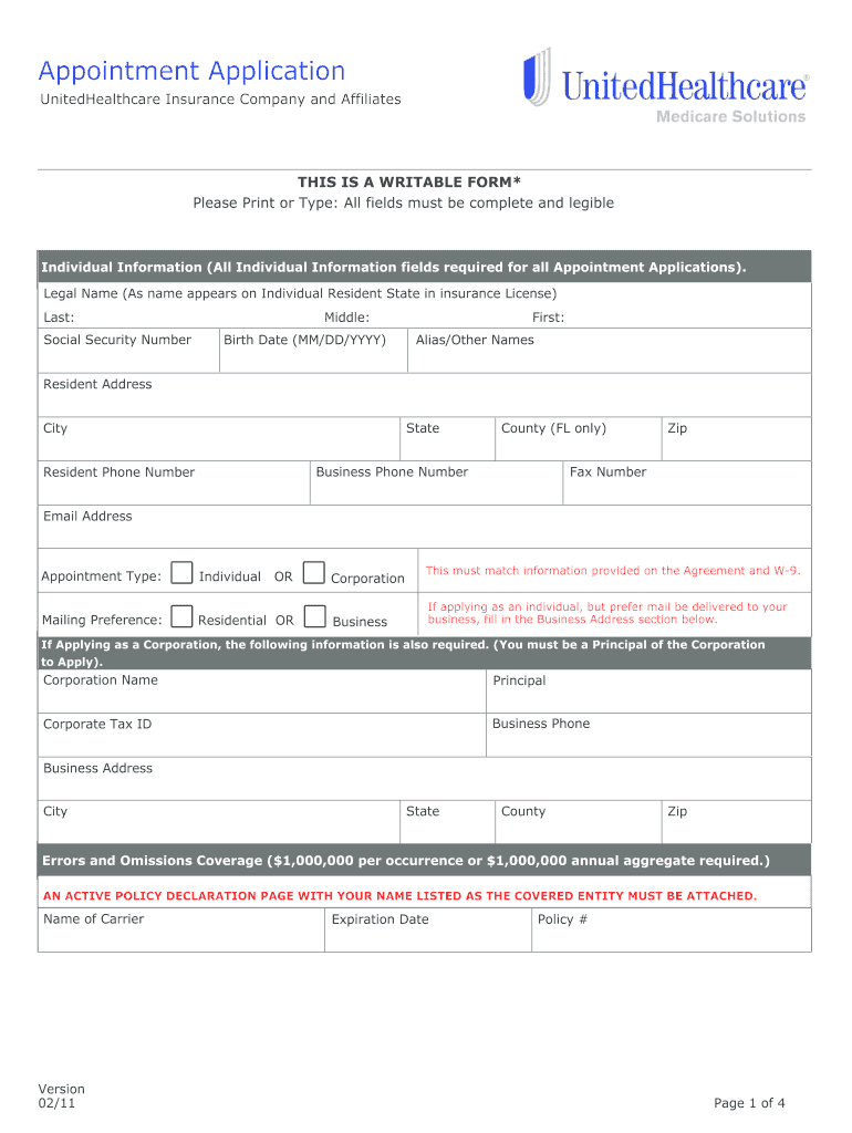 The form is designed for individuals and corporations that wish to apply for an agent appointment with UnitedHealthcare. Applicants must provide proof of licensing and adequate insurance as part of the process.