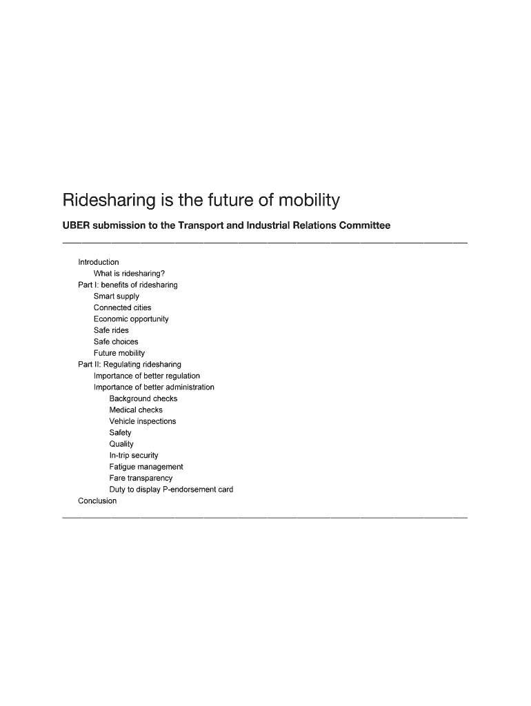 Ride-sharing is the future of mobility UBER submission to the Transport and Industrial Relations Committee Introduction Whatisridesharing? Part:benefitsofridesharing Smart supply Connected cities