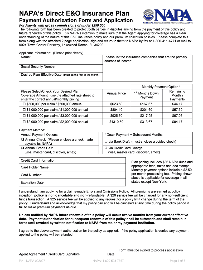 Along with the NAPA E&O Insurance Payment Authorization Form, you may need to submit additional documentation such as proof of income or details regarding your current insurance status. It’s best to check NAPA's specific requirements.