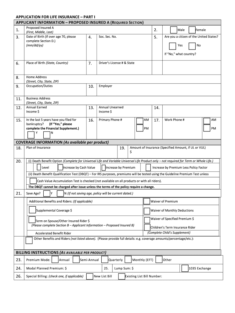 APPLICATION FOR LIFE INSURANCE PART I APPLICANT INFORMATION PROPOSED INSURED A (REQUIRED SECTION) Proposed Insured A 1. (First, Middle, Last)