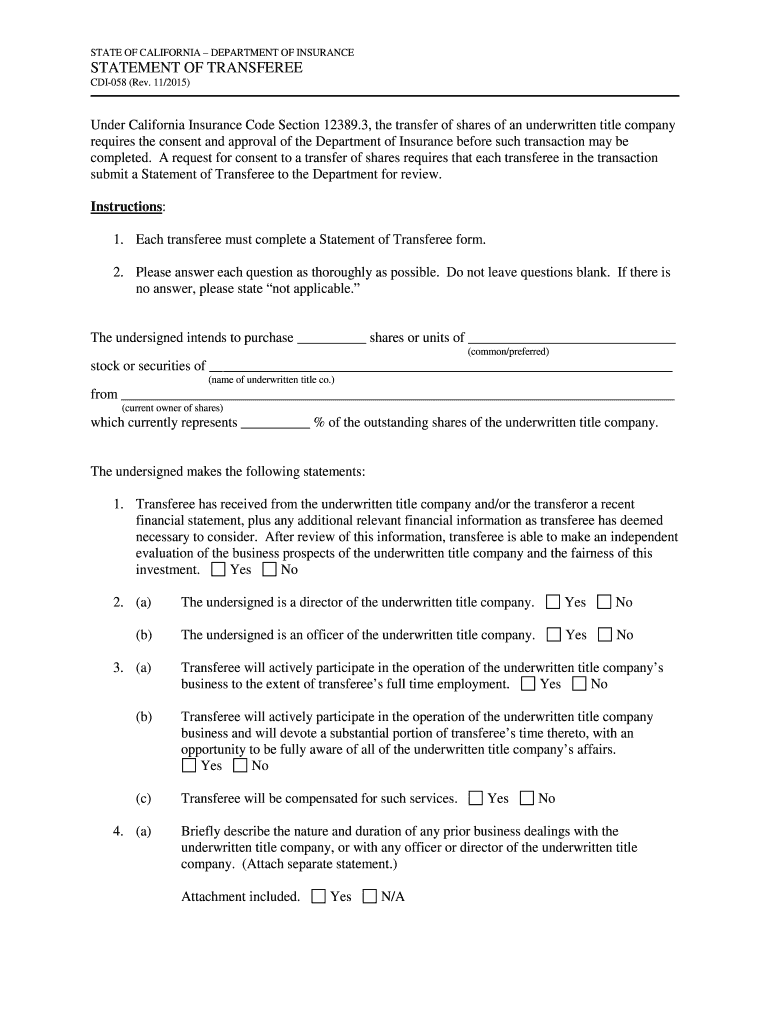 Get the free Statement of transferee - California Department of Insurance - insurance ca