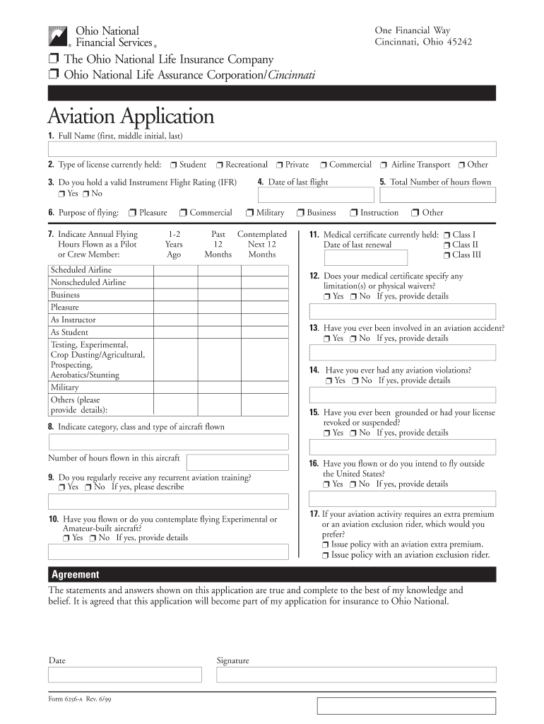 The Ohio National Aviation Application is a personal form used by individuals to apply for aviation insurance with Ohio National Life Insurance Company.