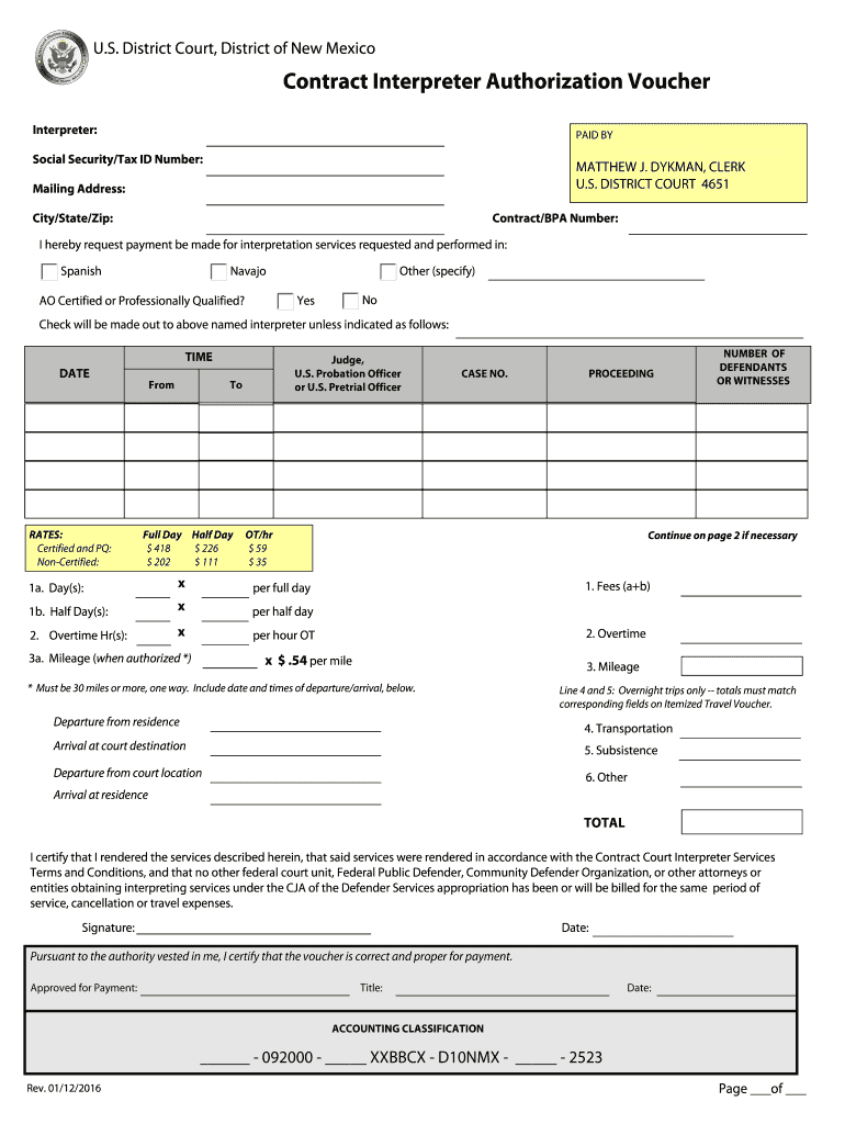 Get the free Interpreter Voucher 01-01-2016-2.pdf - District of New Mexico - nmd uscourts