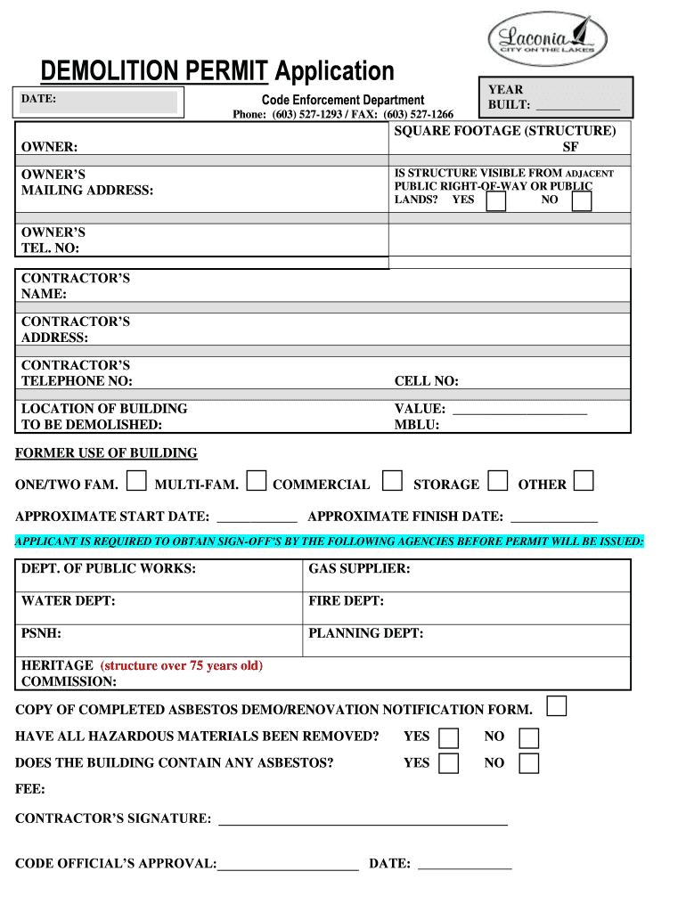 DEMOLITION PERMIT Application Code Enforcement Department DATE: Phone: (603) 5271293 / FAX: (603) 5271266 YEAR BUILT: SQUARE FOOTAGE (STRUCTURE) SF OWNER: OWNERS MAILING ADDRESS: IS STRUCTURE VISIBLE