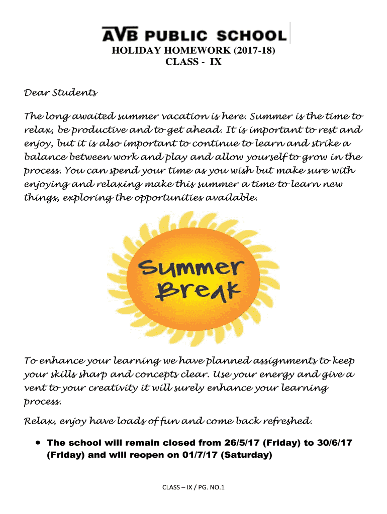 HOLIDAY HOMEWORK (201718) CLASS IX Dear Students The long awaited summer vacation is here. Summer is the time to relax, be productive and to get ahead. It is important to rest and enjoy, but it is