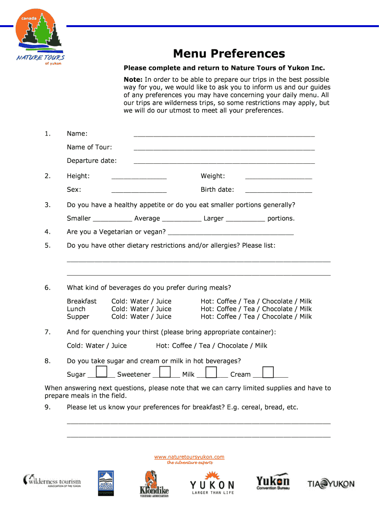 Menu Preferences Please complete and return to Nature Tours of Yukon Inc. Note: In order to be able to prepare our trips in the best possible