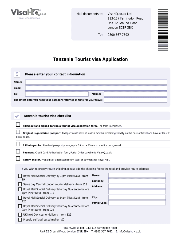 Mail documents to: Tel: Visa HQ.co.UK Ltd. 113-117 Farrington Road Unit 12 First Floor London EC1R 3BX 0800 567 7692 Tanzania Tourist visa Application Please enter your contact information Name: Email: