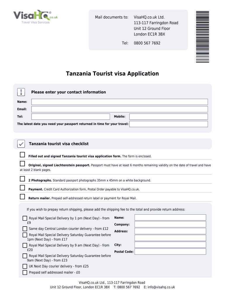 Mail documents to: Tel: Visa HQ.co.UK Ltd. 113-117 Farrington Road Unit 12 First Floor London EC1R 3BX 0800 567 7692 Tanzania Tourist visa Application Please enter your contact information Name: Email:
