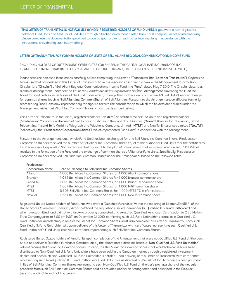 LETTER OF TRANSMITTAL THIS LETTER OF TRANSMITTAL IS NOT FOR USE BY NON-REGISTERED HOLDERS OF FUND UNITS. If you were a non-registered holder of Fund Units and held your Fund Units through a broker,