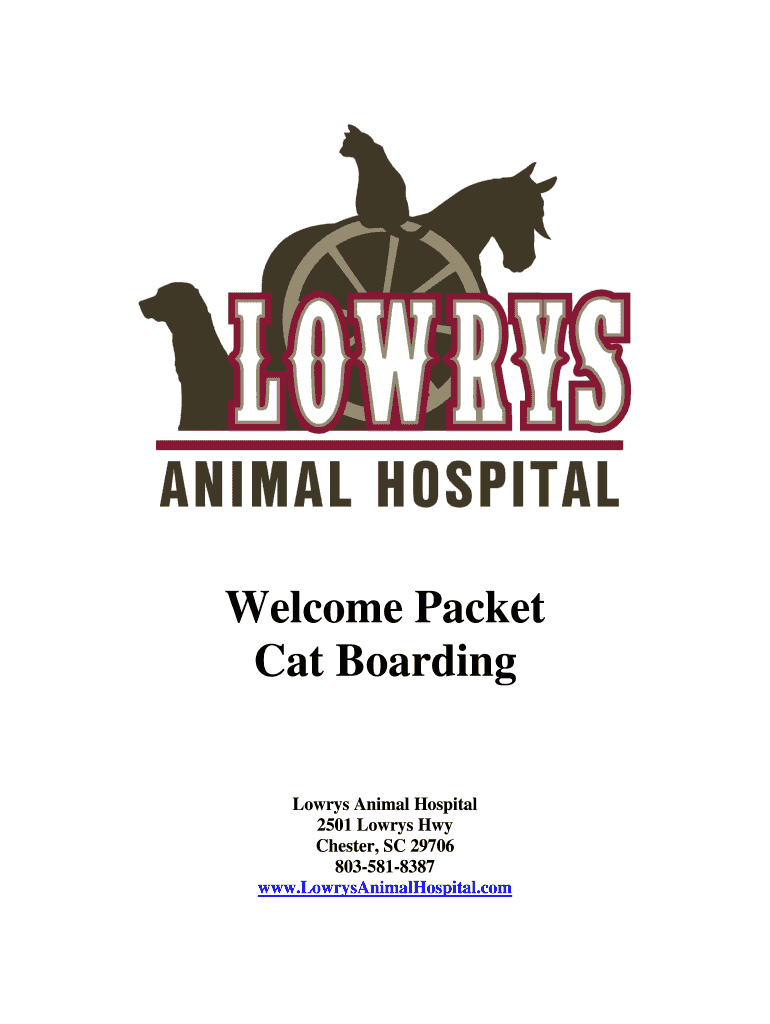 Welcome, Packet Cat Boarding Lowry Animal Hospital 2501 Lowry Hwy Chester, SC 29706 8035818387 www.LowrysAnimalHospital.com Thank you for choosing Lowry Animal Hospital to care for your pet(s) while