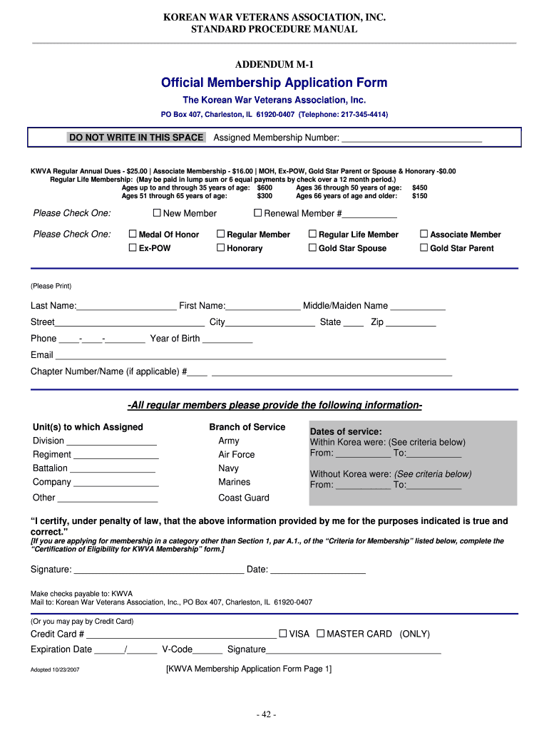 KOREAN WAR VETERANS ASSOCIATION, INC. STANDARD PROCEDURE MANUAL ADDENDUM M-1 Official Membership Application Form The Korean War Veterans Association, Inc. PO Box 407, Charleston, IL 61920-0407 (Telephone: