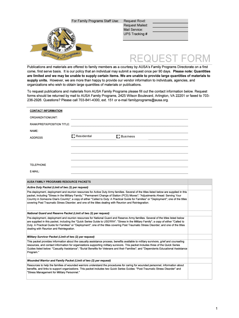 The AUSA Family Programs Resource Request Form is essential for military families seeking access to important resources and publications. This form simplifies the request process, allowing users to obtain necessary materials quickly.