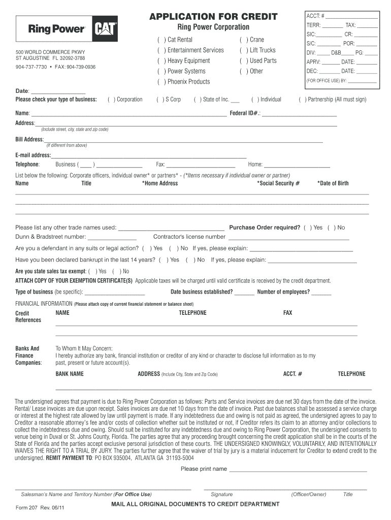 APPLICATION FOR CREDIT ACCT: # TERR: TAX: Ring Power Corporation SIC: CR: () Cat Rental () Entertainment Services () Used Parts APR: DATE: () Power Systems 9047377730 FAX: 9047390936 () Lift Trucks