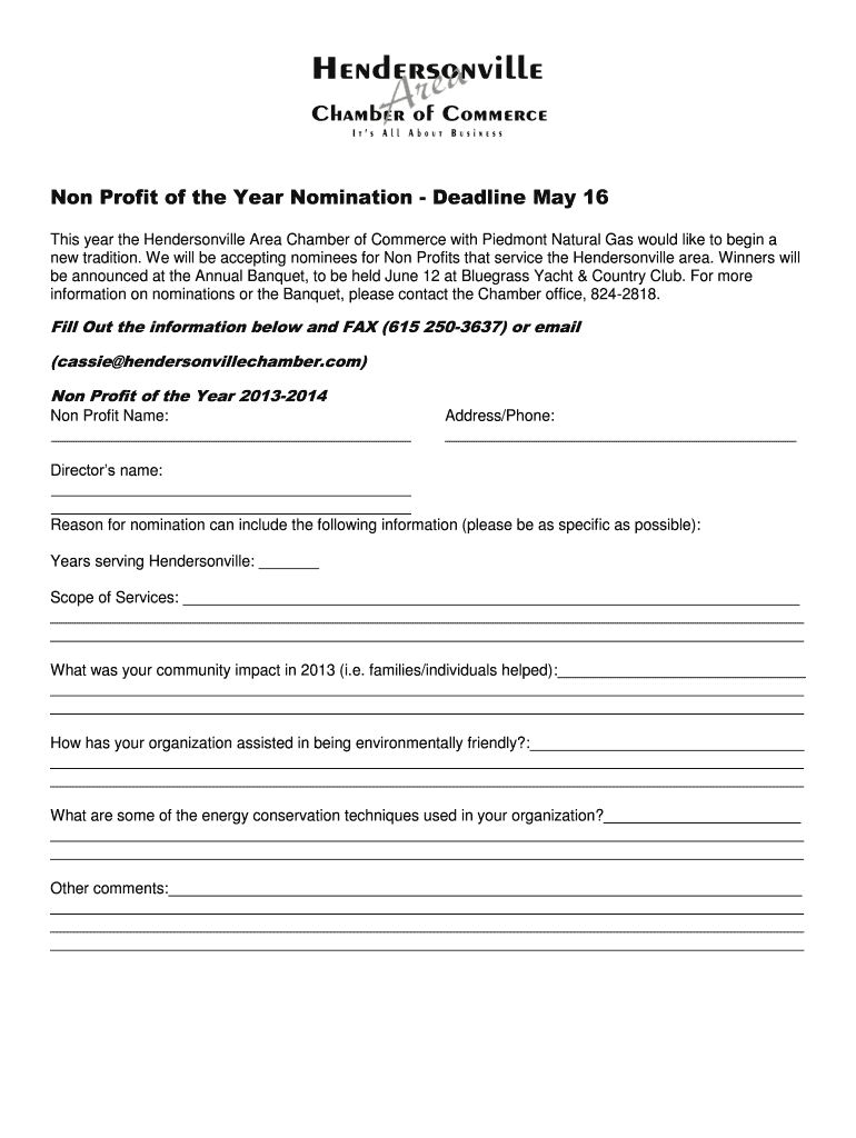 Non Profit of the Year Nomination Deadline May 16 This year the Hendersonville Area Chamber of Commerce with Piedmont Natural Gas would like to begin a new tradition. We will be accepting nominees