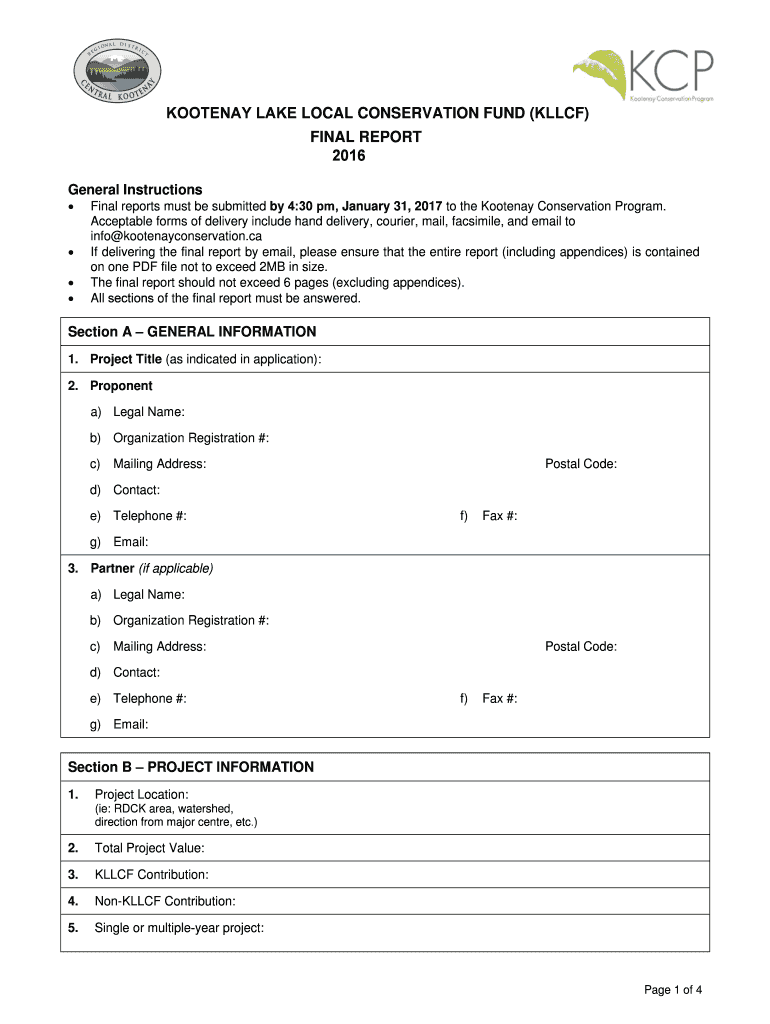KOOTENAI LAKE LOCAL CONSERVATION FUND (KL LCF) FINAL REPORT 2016 General Instructions Final reports must be submitted by 4:30 pm, January 31, 201