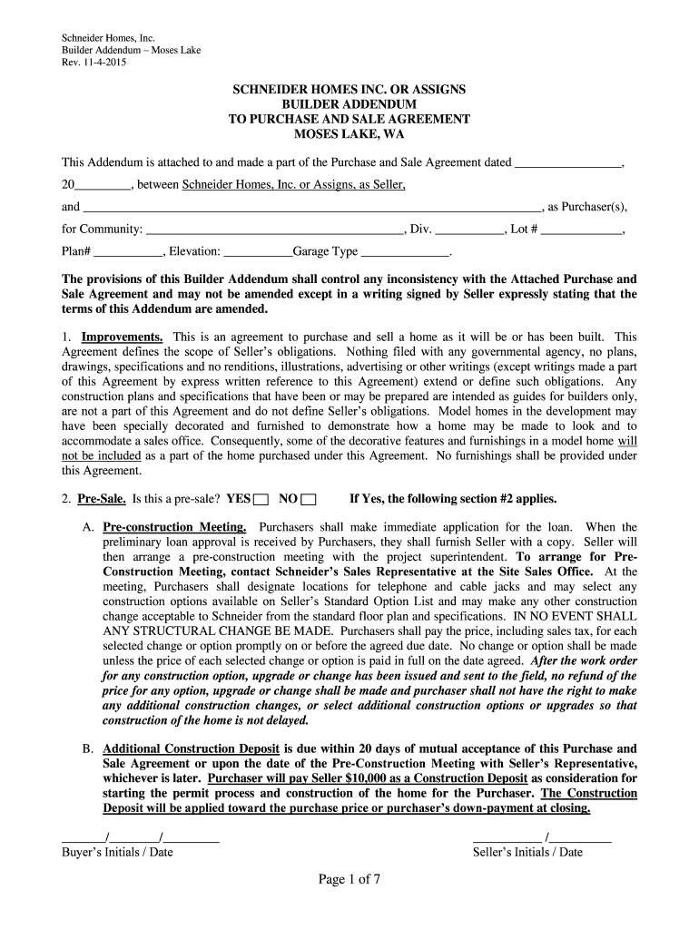 Schneider Homes, Inc. Builder Addendum Moses Lake Rev. 1142015 SCHNEIDER HOMES INC. OR ASSIGNS BUILDER ADDENDUM TO PURCHASE AND SALE AGREEMENT MOSES LAKE, WA This Addendum is attached to and made